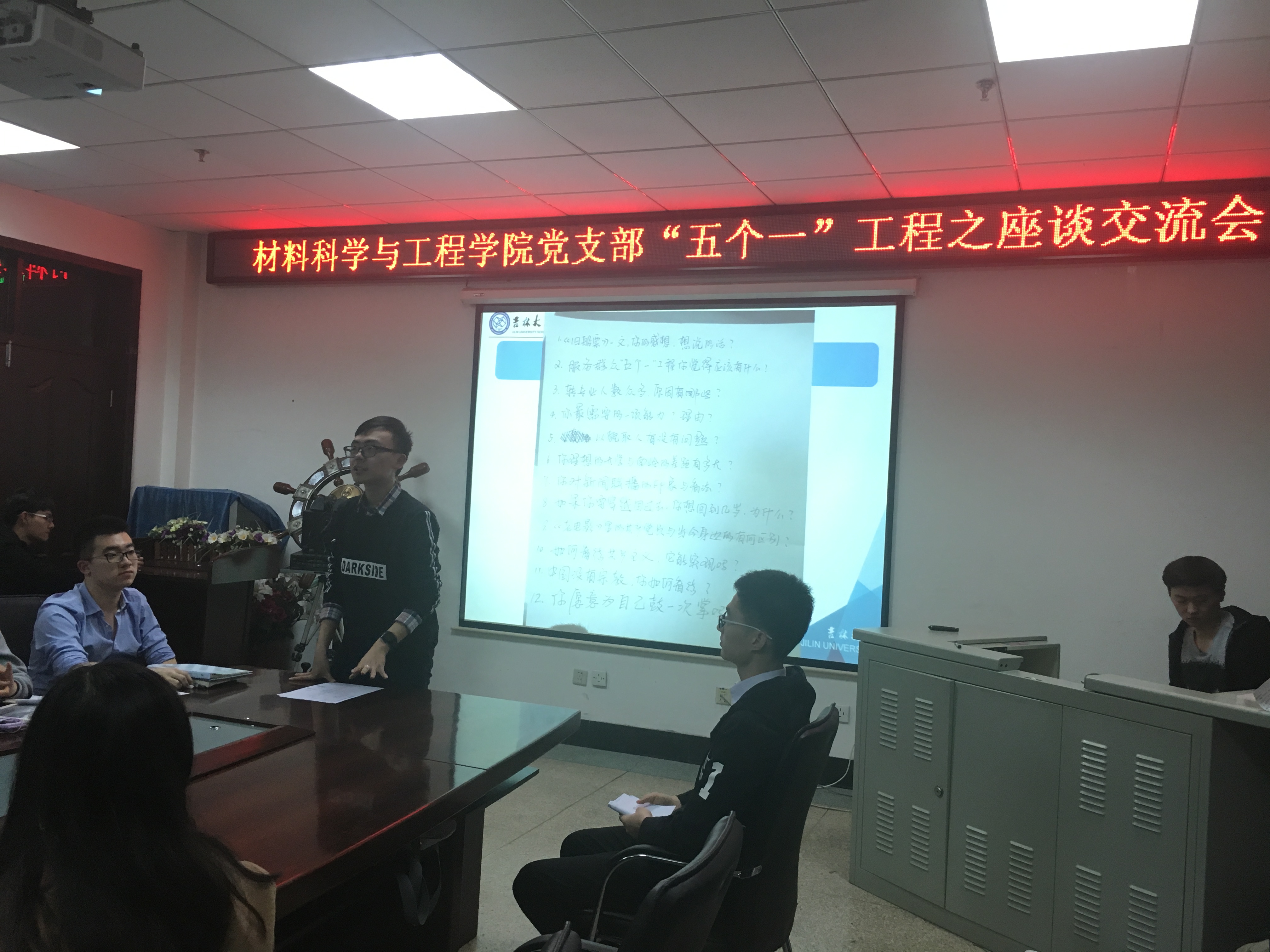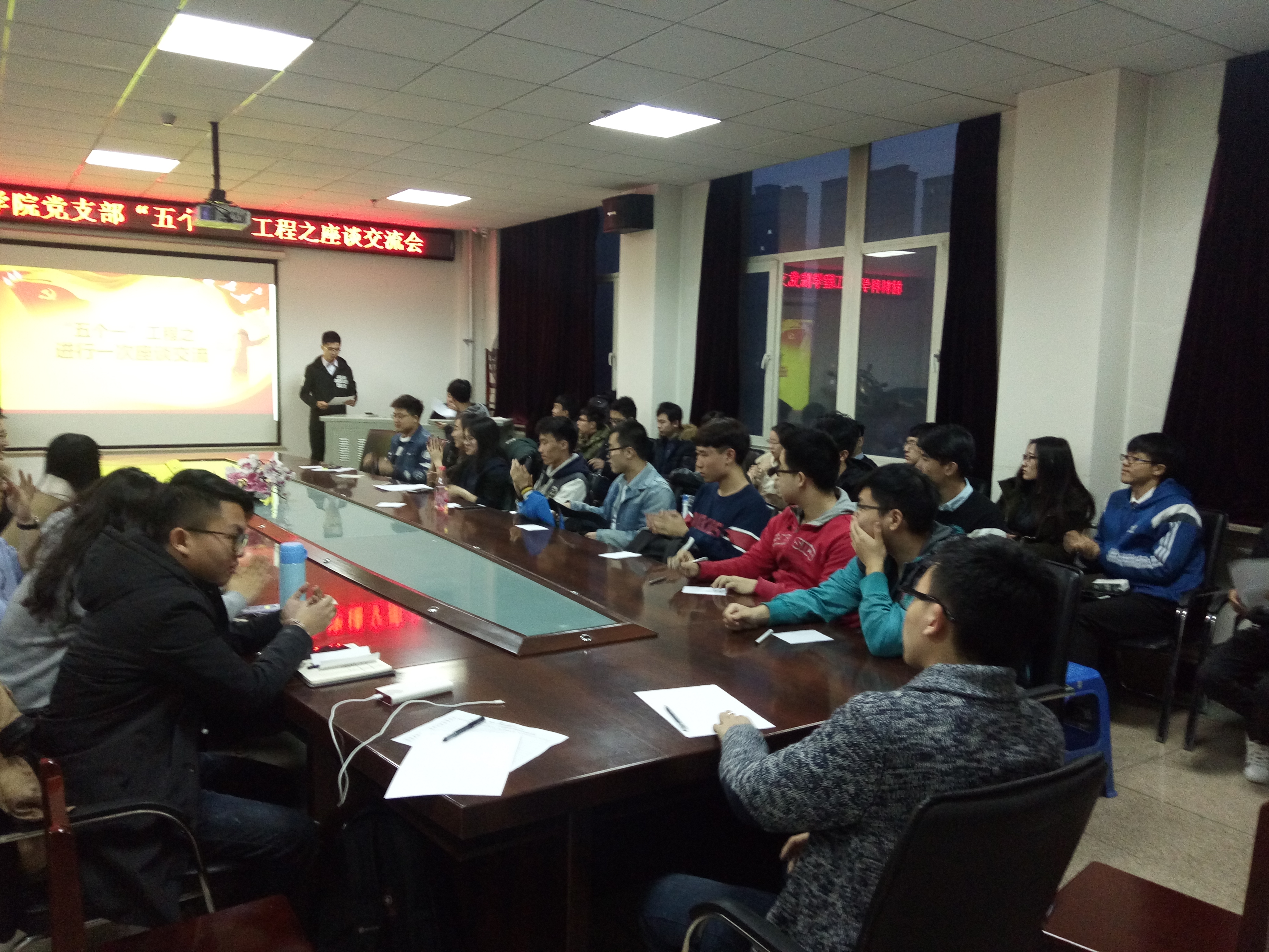 会上首先进行的是“五个一”工程的答辩展示环节,经过2015级各支部负责人严格选拔。各支部积极分子代表采用分组轮流答辩方式在会上汇报活动开展的相关成果,交流相关经验,互相学习借鉴。随后他们对时事政治、大学生活、学业教育等领域的热点问题进行了热烈讨论,积极发言,纷纷表达了自己的观点和看法。在会议的尾声,佟老师对此次会议进行评价和总结,让参与的学生在思想上再提高了一个高度。在此次会议进行期间,各位同学踊跃发言,充分发挥学生党员的先锋模范作用,充分的展示了材料学院学生党员的风貌。至此本次“五个一”工程座谈交流会圆满成功。
