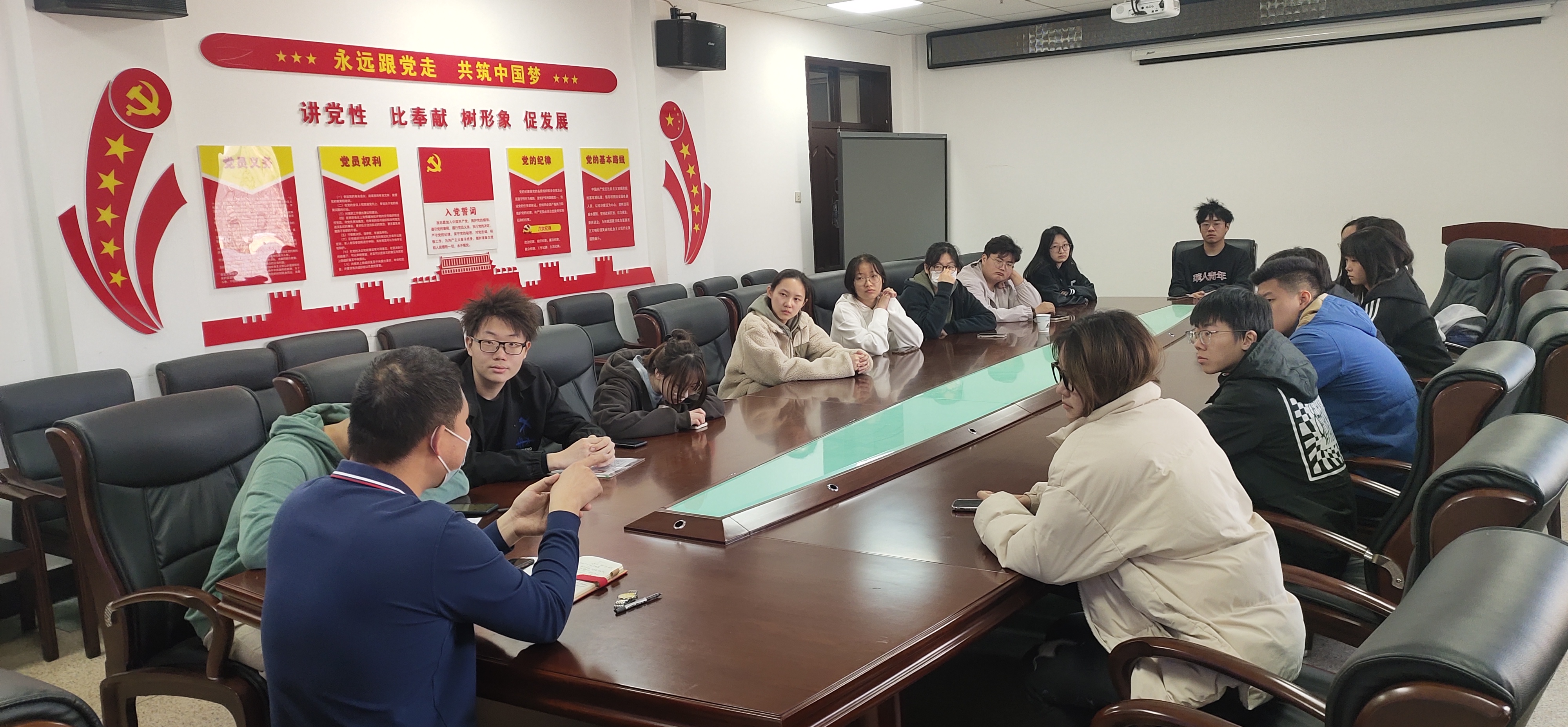 随后,严老师对学期后半段的工作进行布置,对教学班联系人选拔、团推优工作、运动会、学团换届、辅导员助理选拔等工作进行提醒,同时建议同学们协调好学习、工作和生活的关系,要充分利用课余时间,及时进行各门专业课程的学习,同学们要以更加积极向上的心态去完成相关学习和工作任务,并注意思考和总结,不断在学习、工作和生活中锻炼和提升自己,同时,各班级班长、团支书对本班同学本学期的学习、工作和生活状态进行了交流。