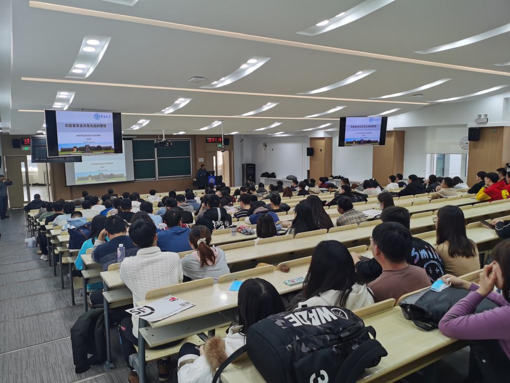 首先,学院党委副书记曲贵文重点强调了实验室安全、消防安全、网络安全、假期安全、疫情防控工作等方面的要求,引导学生树立安全意识,提高自我防范能力。随后,学院副院长韩奇钢宣读了学院关于南区实验室近期防火安全事件的处理意见,并强调了实验室安全的重要性,要求学院全体师生一定要以实验室安全为己任开展教学、科研工作。最后,孙国恩老师以《实验室危化品的管理和安全使用》为题,重点讲解了危险化学品的基础知识、使用防护和安全管理等方面的要求。