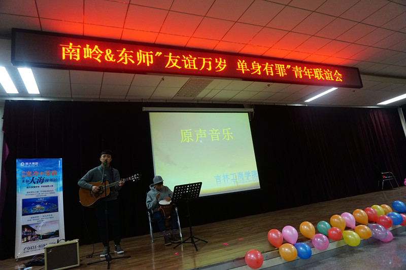 伴随着浪漫的背景音乐,单身联谊会正式开始。一段热辣的开场舞引来全场的阵阵欢呼。随后,在主持人的引导下,到场的同学参加了一系列游戏:多人抱团,二人三足,双人背气球,猪八戒背媳妇,获胜的同学获得了精美的奖品,幸运观众还获得了恒大集团赞助的暖手宝、优盘和挂烫机等纪念品。随着活动的进行,现场氛围被充分地调动起来。活动期间的各类才艺表演更是让在场观众掌声不断,酷炫的街舞表演,优雅的吉他弹奏,动听的女生独唱,更有现场观众自告奋勇,上台表演,将联谊活动不断推向高潮,洋溢着温馨、喜悦之情。伴随着吉林工商学院原声乐队悠扬的民谣演唱,单身联谊会落下了完美的帷幕。同学们在活动的过程中,收获了快乐,也结识了新的朋友。