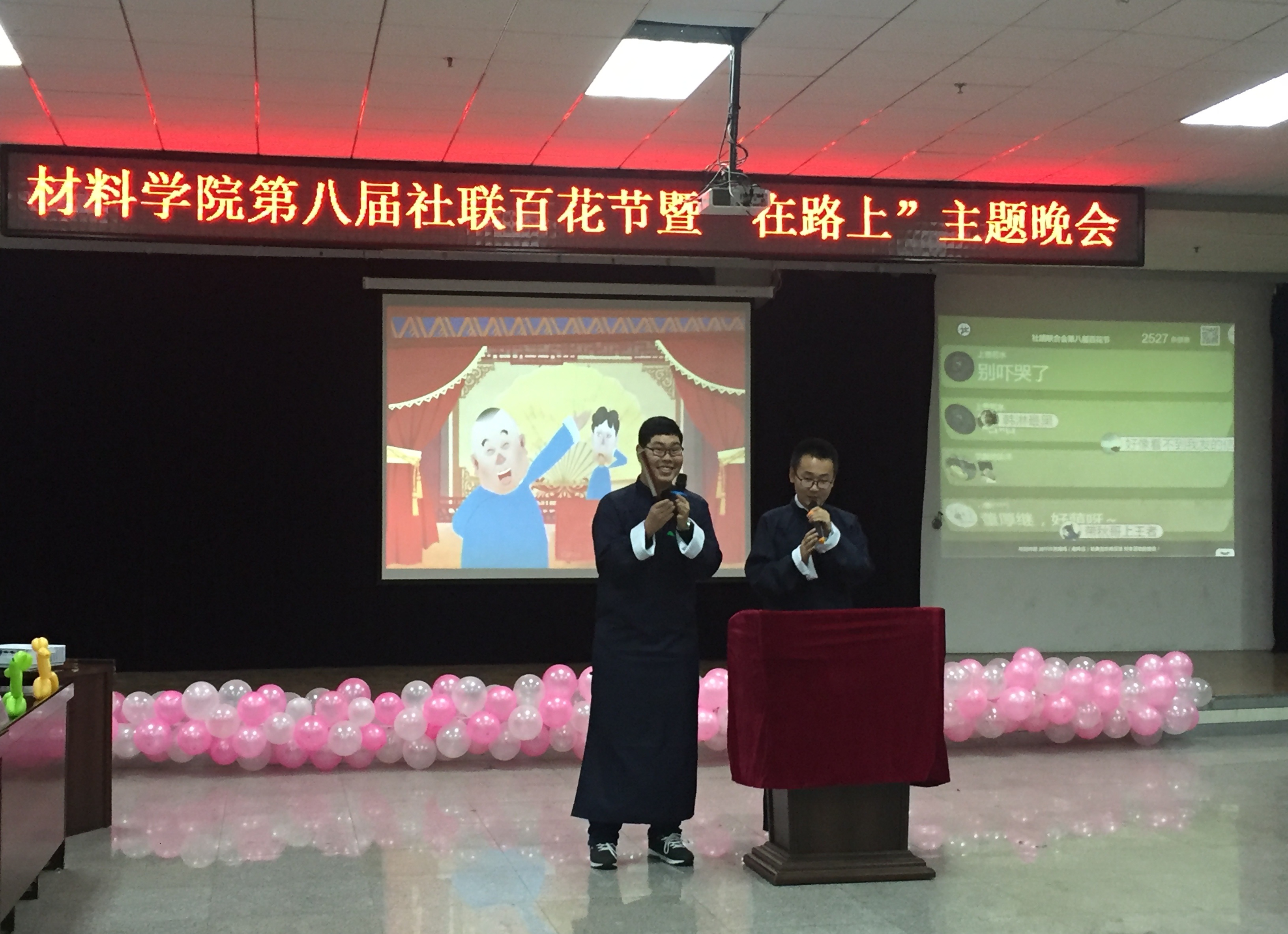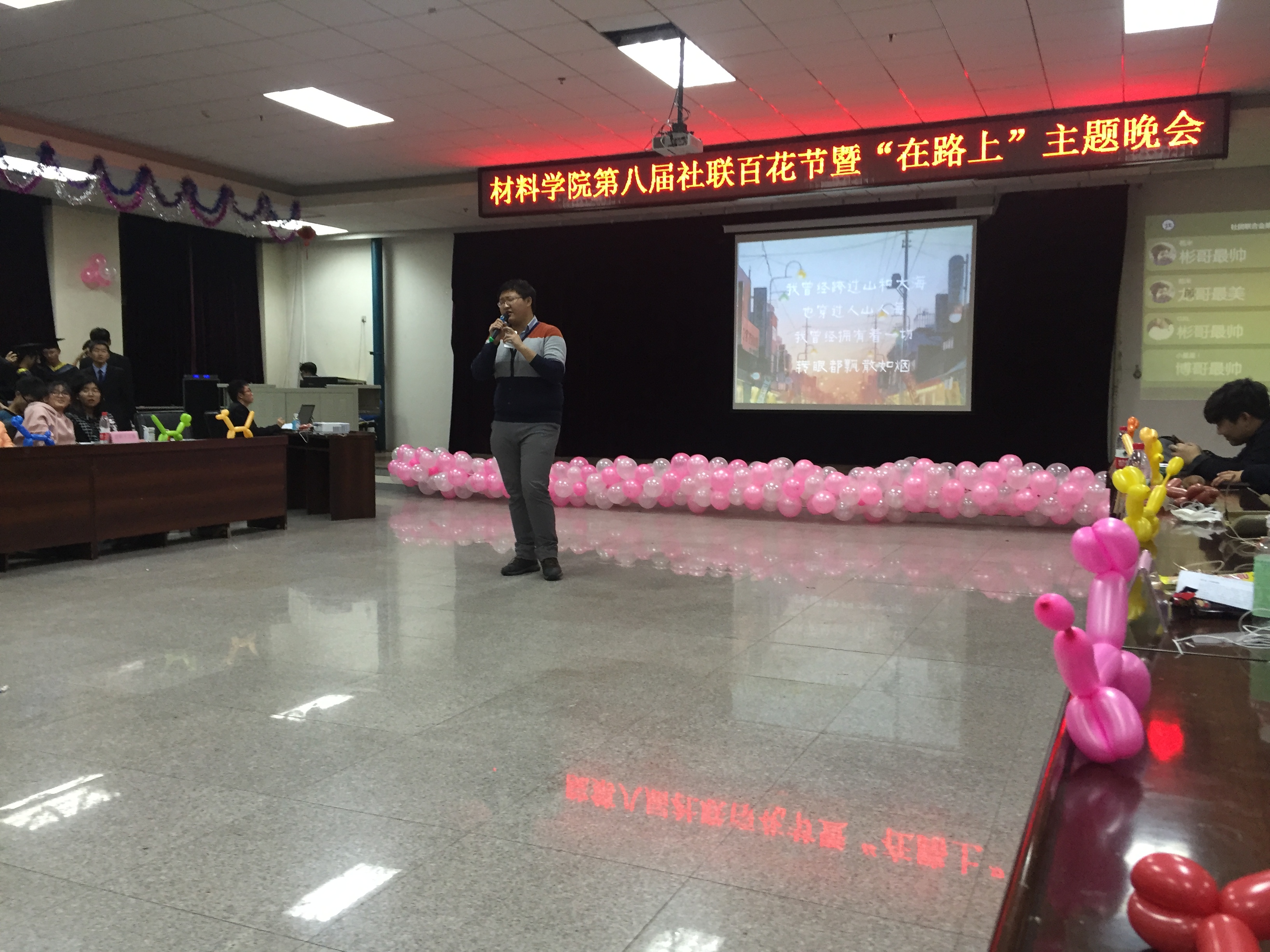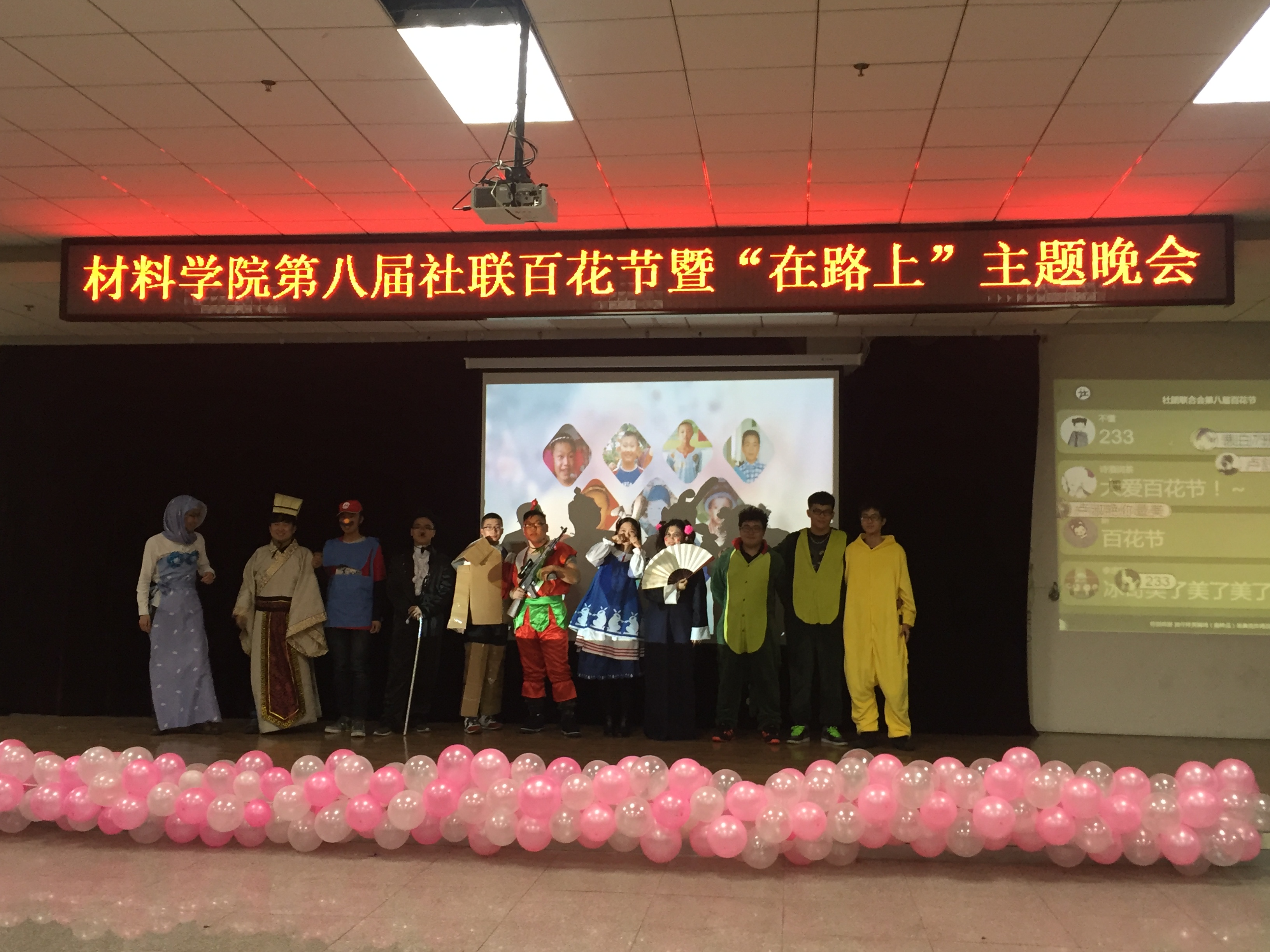 社团联合会精心筹办的“在路上”百花节主题晚会在逸夫机械材料馆八楼报告厅隆重开幕。材料学院2015级辅导员佟昊天、2016级各班辅导员助理及学团委主席团成员出席本次晚会。