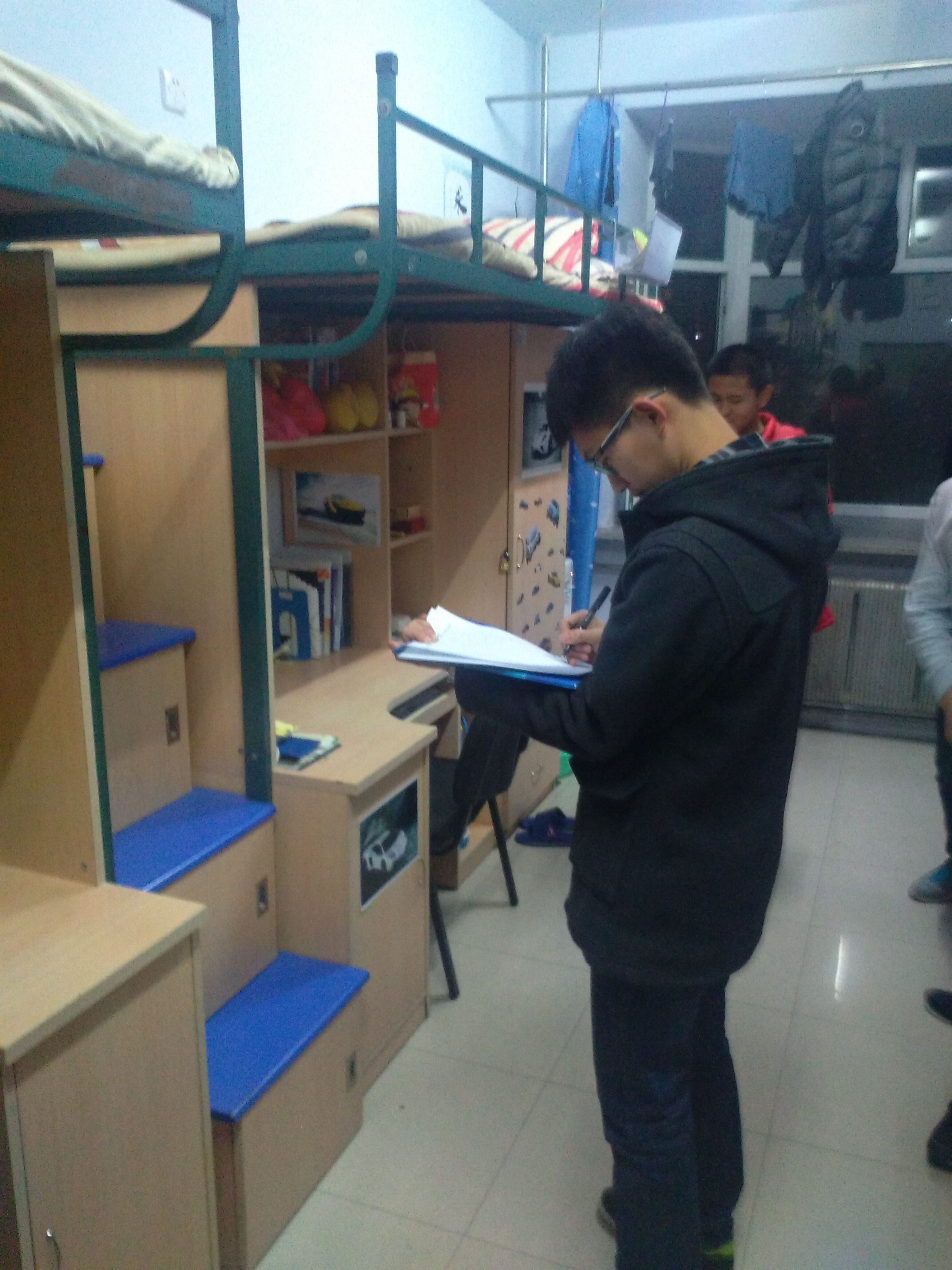 学生会于4月19日晚对材料学院12级、15级本科生寝室进行检查。本次活动主要针对各个寝室的卫生条件与文化氛围进行检查,也对寝室防火防盗设施情况进行基本的了解,贯彻并普及寝室立项“室”界活动的核心思想。