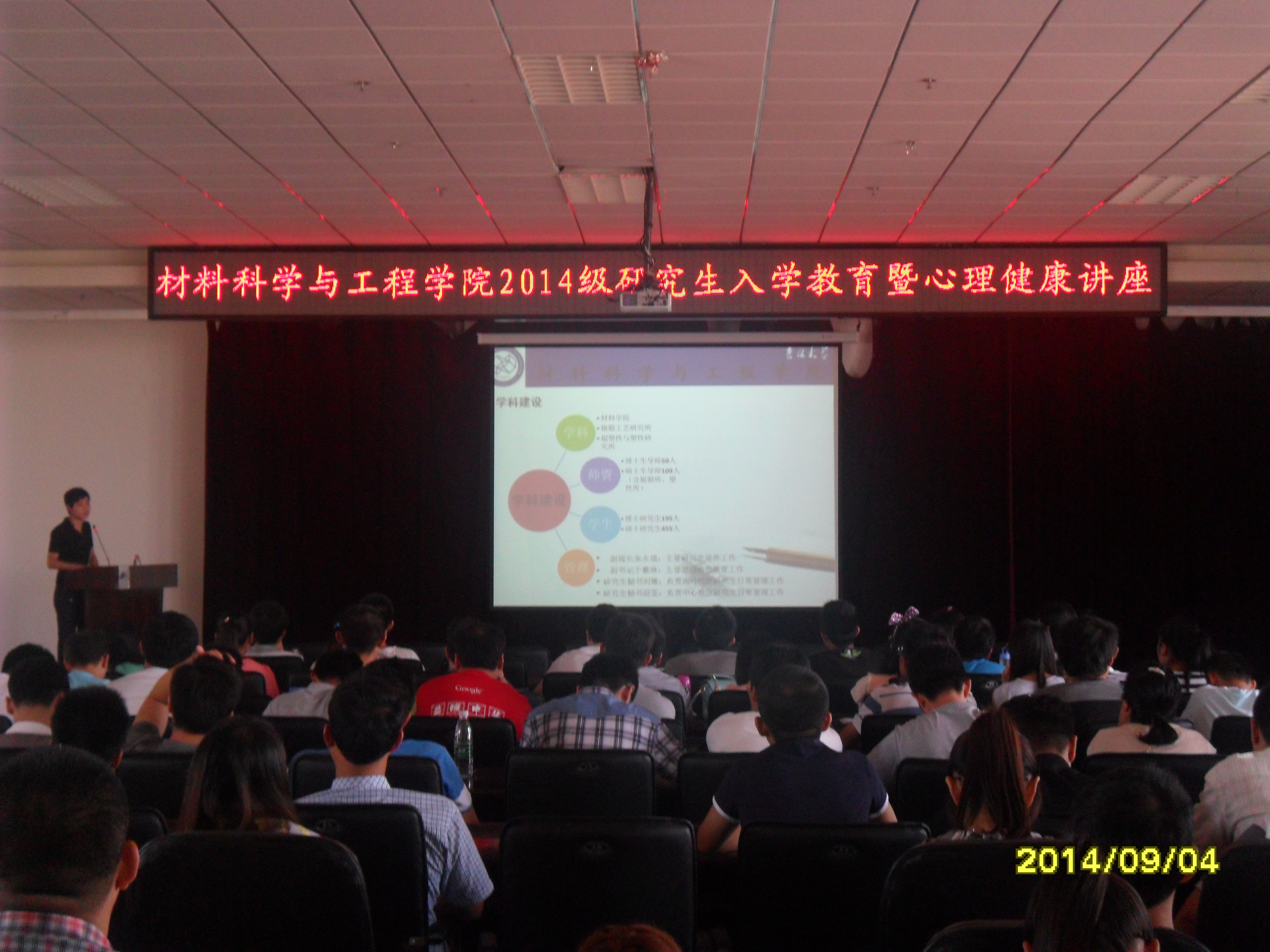 2014年9月4日上午,我院在逸夫机械材料馆举行了研究生入学教育暨心理健康专题讲座。材料学院党委副书记于雅琳老师主持了本次讲座,研究生办公室秘书刘徽老师及2014级全体硕士、博士研究生参加了本次讲座。