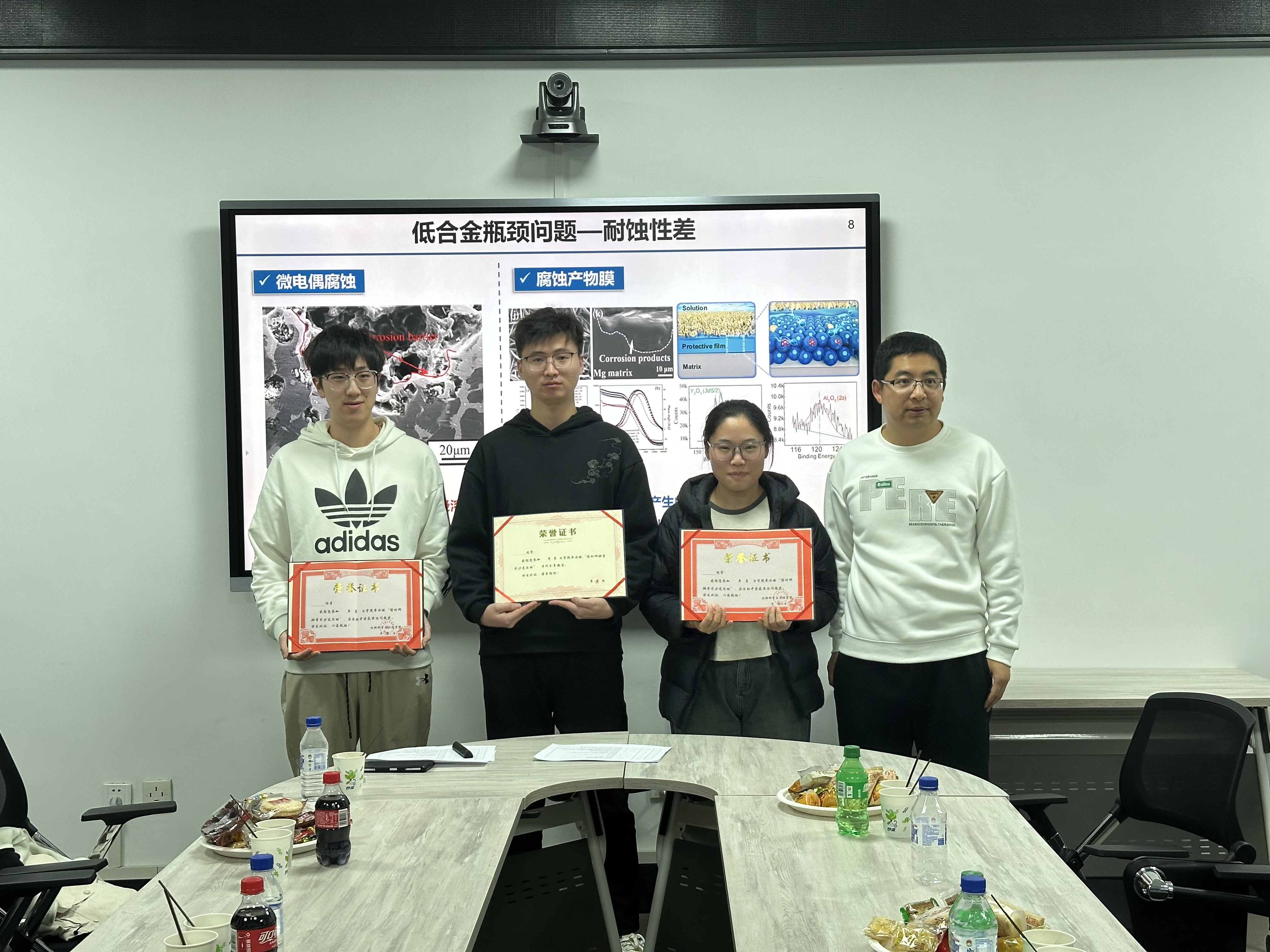 刘识同学分享的主题是Mg-Al-Ca-Mn低合金是近年来开发的极具商业化潜力的高性能镁合金体系,在多方面具有突出优势,不仅具有优异的加工成形性能,还具备快速时效硬化响应能力,能够通过短时时效处理析出高密度的GP区,大幅提高合金屈服强度。但合金在高温T4处理过程中晶粒容易发生异常长大,通过稀土元素Gd的添加能够细化合金中纳米相,并且改善其分布均匀性,有效提升合金的高温热稳定性。此外,Gd元素能够大幅度提升合金的耐蚀能力,一方面降低第二相与镁基体之间的电位差,微电偶腐蚀程度大幅减弱,另一方面提高表面膜层的稳定性和钝化能力。