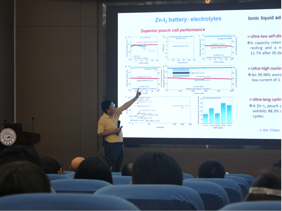乔世璋院士的本次讲座聚焦绿色能源技术前沿,系统展示了研究团队在电催化海水制氢与先进电池领域取得的突破性进展。在绿色制氢方面,报告深入介绍了团队如何通过深刻理解反应机理并成功设计高性能双功能电催化剂,实现了利用风电、光伏等可再生能源直接高效分解海水制氢的关键技术突破,为化工行业深度脱碳开辟了一条极具前景的全新路径。在先进电池方向,团队同样成果斐然:针对水系锌基电池,成功开发出高耐用性的工业级锌碘(Zn-I2)袋式电池,该电池即使在苛刻工况(如高载量阴极、限锌阳极)下也表现出优异的稳定性;更引人瞩目的是,团队创新性地利用高度可逆的四电子转移反应(I-/I2/I+)策略,显著提升了电池的能量密度。而在金属硫电池领域,报告则揭示了实现高功率性能的关键——团队在纳米复合催化剂设计原理上的重要发现。整场报告内容翔实、视野前瞻,既呈现了具有实际应用潜力的创新成果(如工业级电池),又深入解析了核心科学原理(如反应机理与催化剂设计),为解决当前能源技术难题提供了新方案,也为开发下一代高性能、可持续能源技术指明了方向,令听众深受启发。