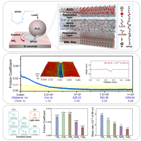 基于上述挑战,研究团队将研究体系由传统的弱剪切润滑材料体系转向超硬/高硬耐磨材料,尝试构建与服役环境相耦合的固—液复合润滑体系。由于过渡族金属的高电子密度带来了高抗压缩能力,而硼的强共价键网络提供了高抗变形能力,综合所长形成的过渡族金属二硼化物(TMB2)具有优异的力学强度,而成为一类经典的超硬/高硬薄膜材料,这也是实现高耐磨性指标的关键特性。为了进一步获得超滑特性,研究团队在TMB2薄膜的服役环境中引入不饱和植物油,发现在摩擦负载驱动下,硼化物与不饱和植物油之间发生摩擦催化,促进接触界面处形成有机自组装钝化层,进而在边界润滑与弹流润滑的共同作用下成功实现了公里级的超滑(摩擦系数低至0.002)和耐磨(磨损率低至10−19m3/N·m)特性。这一工作为超滑家族引入了过渡族金属二硼化物这一全新体系,并且结合其高强度高硬度的特性实现了长时耐用的宏观超滑,该策略在具有挑战性的大规模工作条件(乃至工业尺度)下具有广阔的应用前景。