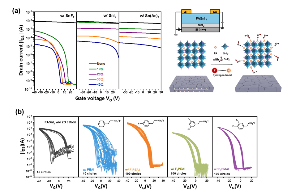 图1(a)采用不同锡补偿剂制备的FASnI3FETs。F-和FA+离子之间的氢键有效地抑制了有机阳离子迁移,使器件表现出较好的场效应特性。(b)采用氟代低维有机阳离子制备的锡基钙钛矿晶体管,其表现出较好的器件性能和操作稳定性。