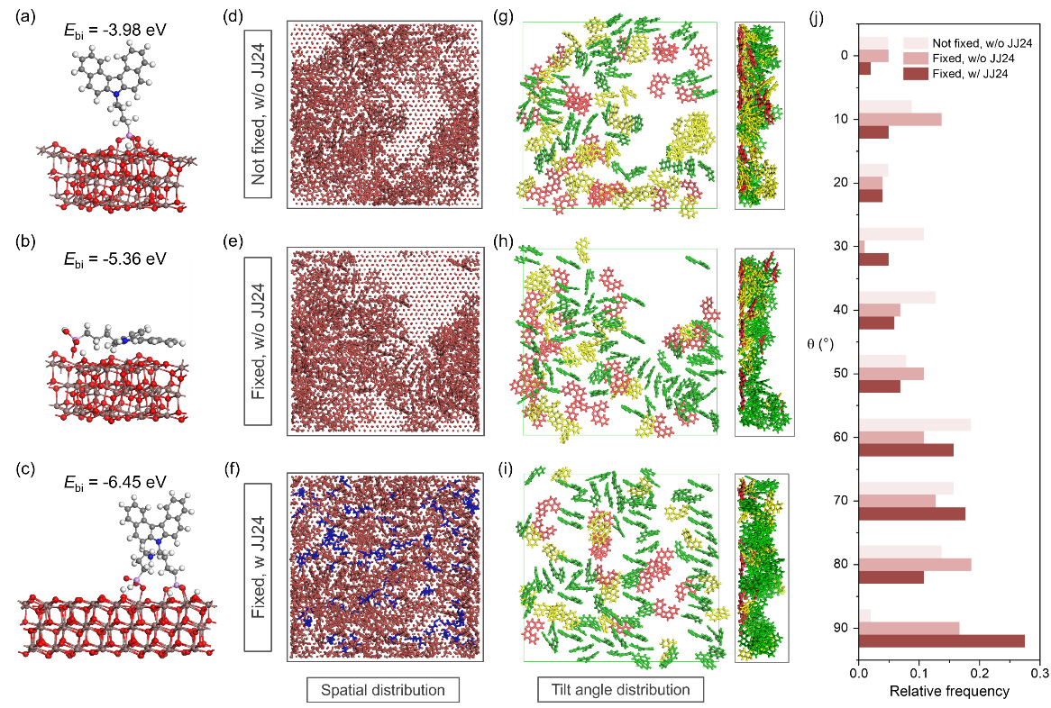 理论计算表明单一的CbzNaph分子因其柔性烷基链及与ITO之间较强的结合能更趋向于平躺在ITO基底上(图2b),而非竖直式结合(图2a)。而交联SAM优化了分子取向,更趋向直立于ITO基底上(图2c)。此外,JJ24的引入还提供了额外的锚定位点,显著增强了SAM与基底的附着力。分子动力学模拟显示,CbzNaph分子倾向于形成不完整的覆盖(图2d-f),而引入JJ24后,交联SAM的分子倾斜角增大(图2g-j),SAM分子分布匀性显著提高,这有效避免了钙钛矿与ITO的直接接触,降低了电荷复合与钙钛矿降解的风险。