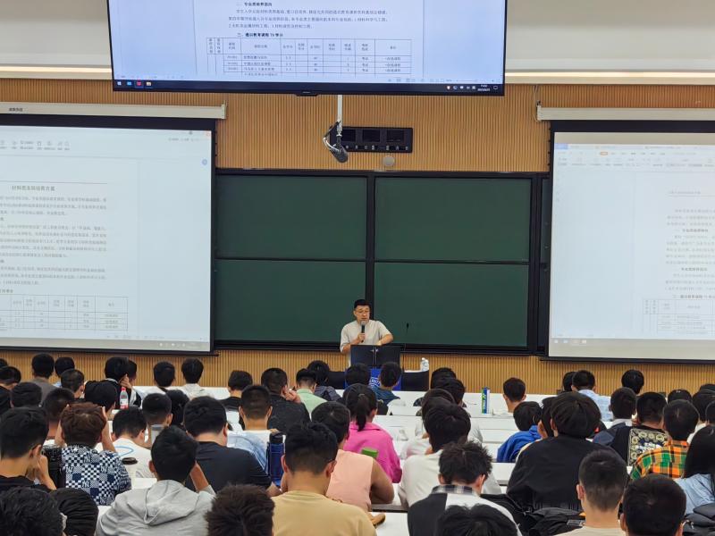 教务办公室刘建明老师主讲,学院2021级、2023级材料类专业辅导员严冬老师和全体2023级本科生新生参加了本次活动。