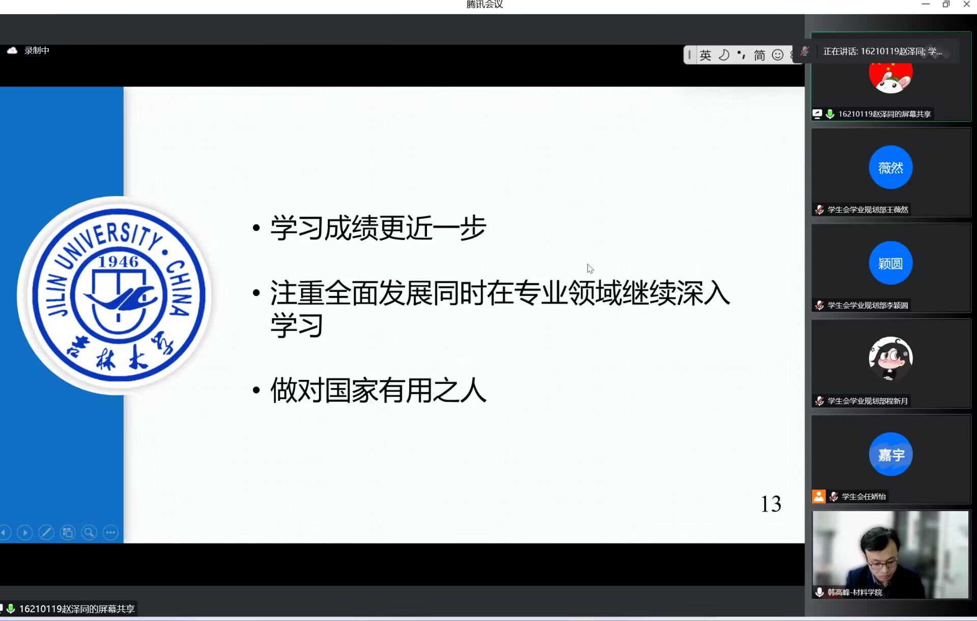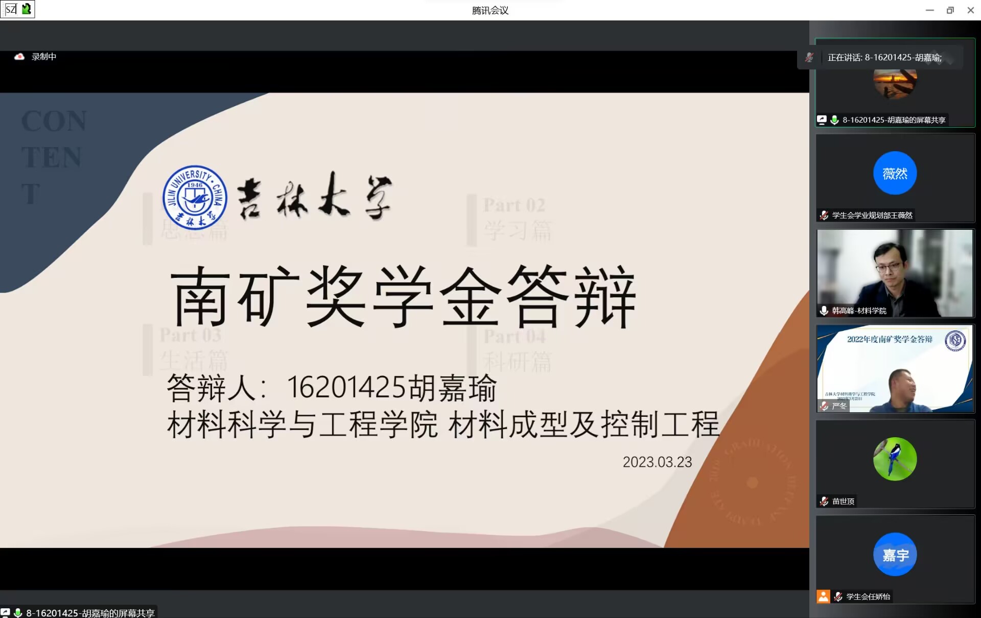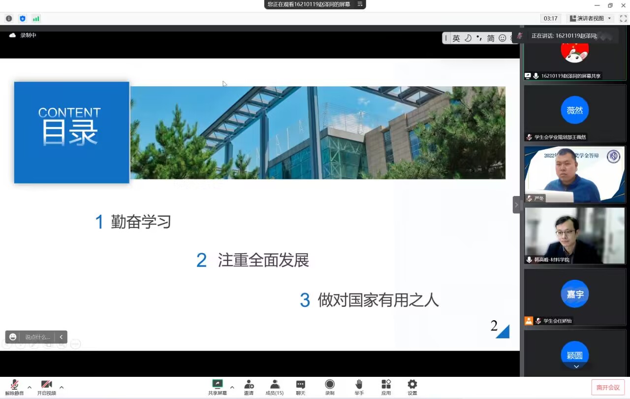 于2023年3月23日晚19:00,在腾讯会议线上召开了南矿奖学金评审答辩会。学院党委副书记兼副院长华蕊、材料科学系王海涛老师、无机非金属材料工程专业苗世顶老师、金属材料工程专业韩高峰老师、材料加工工程系于歌老师、本科生辅导员严冬、王晗、张晗禹出席本次评审答辩会并担任评委。