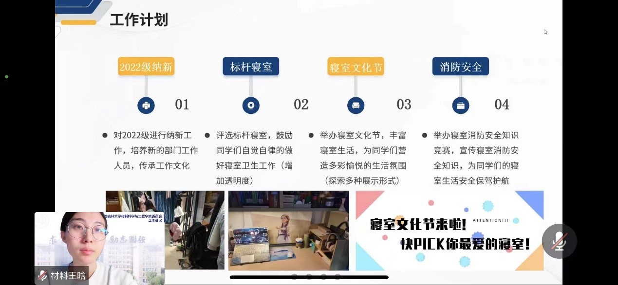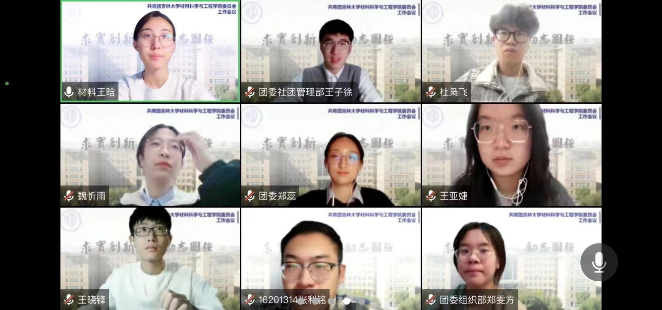 2020级本科生团学组织于线上进行阶段性工作汇报以及工作展望,材料学院团学组织主席团及各部门负责人全员参与,学院团委负责人兼本科生2022级、2020级辅导员王晗主持本次活动。