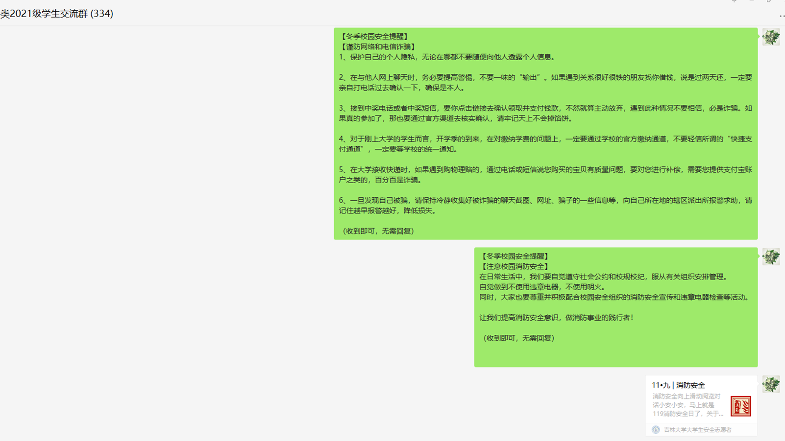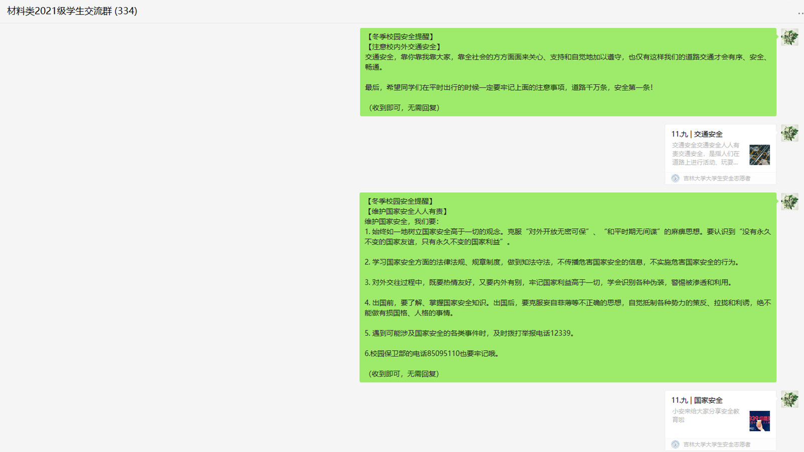 2021级新生入学教育工作方案》等相关工作要求,为更好地落实校园安全教育,在辅导员严冬老师的组织和带领下,2021级材料类学生积极参与到本次活动中。本次活动分为消防实际疏散演练、校园违章电器展示、禁毒宣传、防电信诈骗、交通安全、国家安全等六个活动板块,2021级材料类学生参加到全部六个板块的活动中,对“校园安全”这一核心主题有了更深刻的理解。与此同时,辅导员严冬老师面向2021级材料类全体新生同学开展线上主题安全教育,有效的防范了校园安全风险。