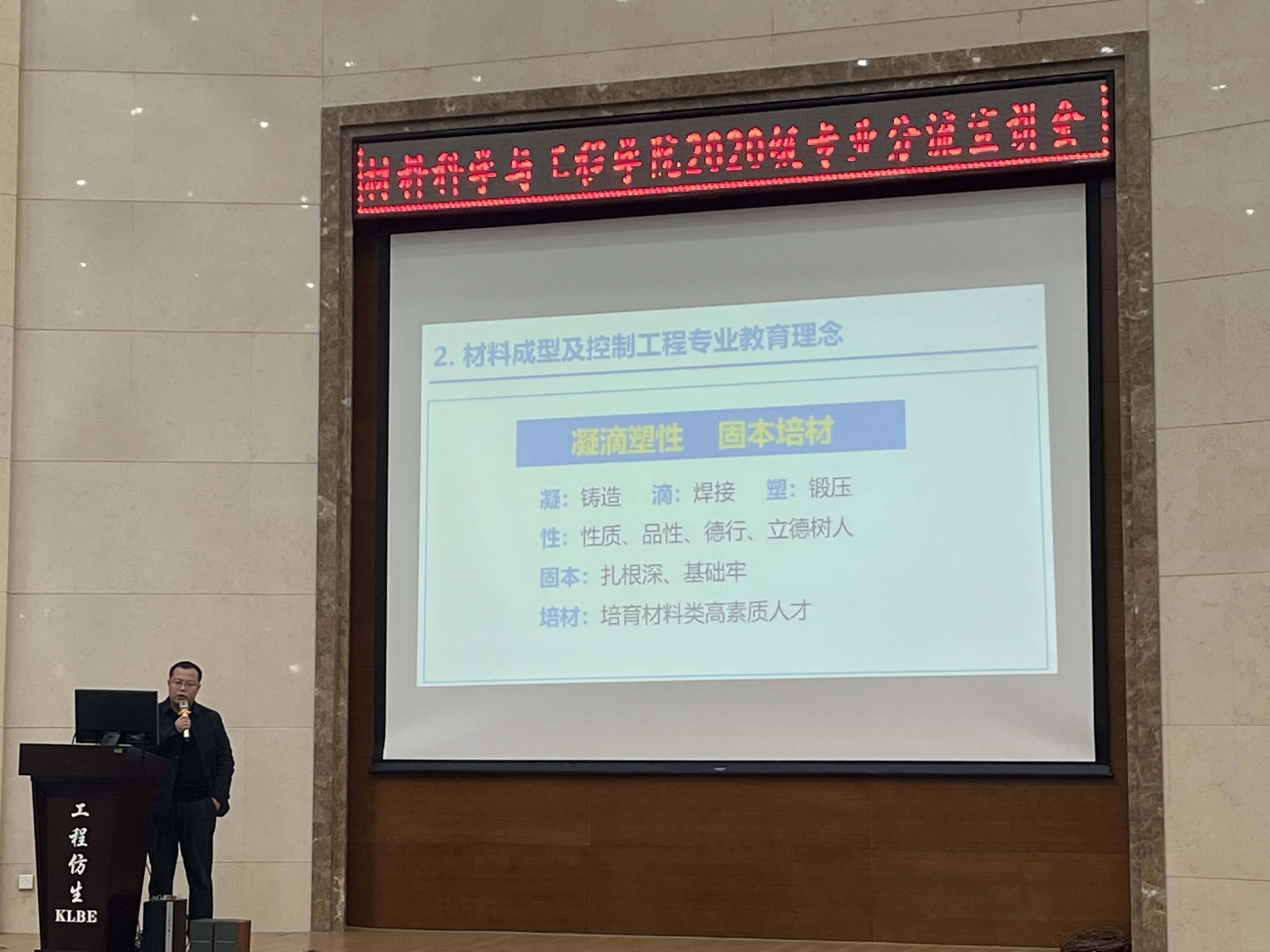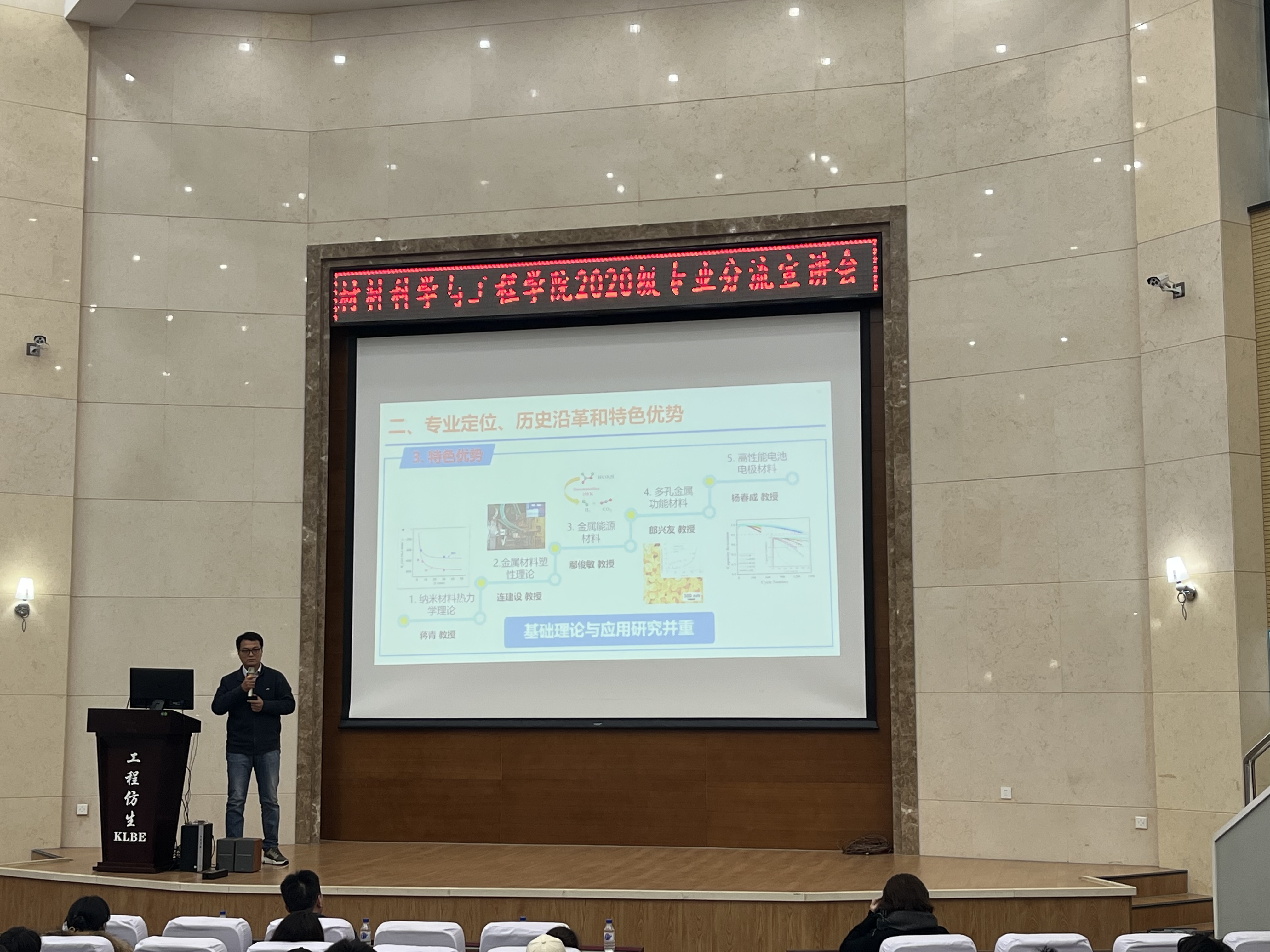会议伊始,华蕊老师为到场同学宣读了《关于2020级本科生秋季学期专业分流工作的相关要求》,强调传达了专业分流的原则,即尊重学生发展,充分考虑学科学术生态,专业用途,社会需求等因素,以及坚持公平公正公开的原则。随后,四位来自不同专业方向的系主任老师为到场同学介绍各自学科情况。高分子材料与工程系主任于开锋教授介绍了专业概况,并强调本更偏向于工程实践的特点,基于此他还就专业开设的研究方向进行大致介绍,并站在同学的角度解答了对未来前景的疑虑。材料成型及控制工程系主任赵小辉教授明确了材料成型及控制系的三个模块设计,并向同学们传达了“凝滴塑性,固本培才”的教育理念,强调了基础研究与应用研究并重的基本方向,并提出了“科研之美”,希望同学们可以在工科的实践中发现兴趣与爱好。金属材料工程系主任王国勇教授在分享过程中将学科特点及优势与到场同学分享,并在最后鼓励大家踏踏实实做好个人能力提升以及方向选择。无机非金属材料工程系主任苗世顶教授介绍了专业课程设置及科研前景,并且切实从同学角度出发谈到了无机非金属材料系的未来职业发展。