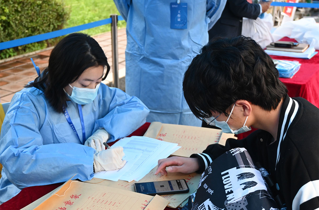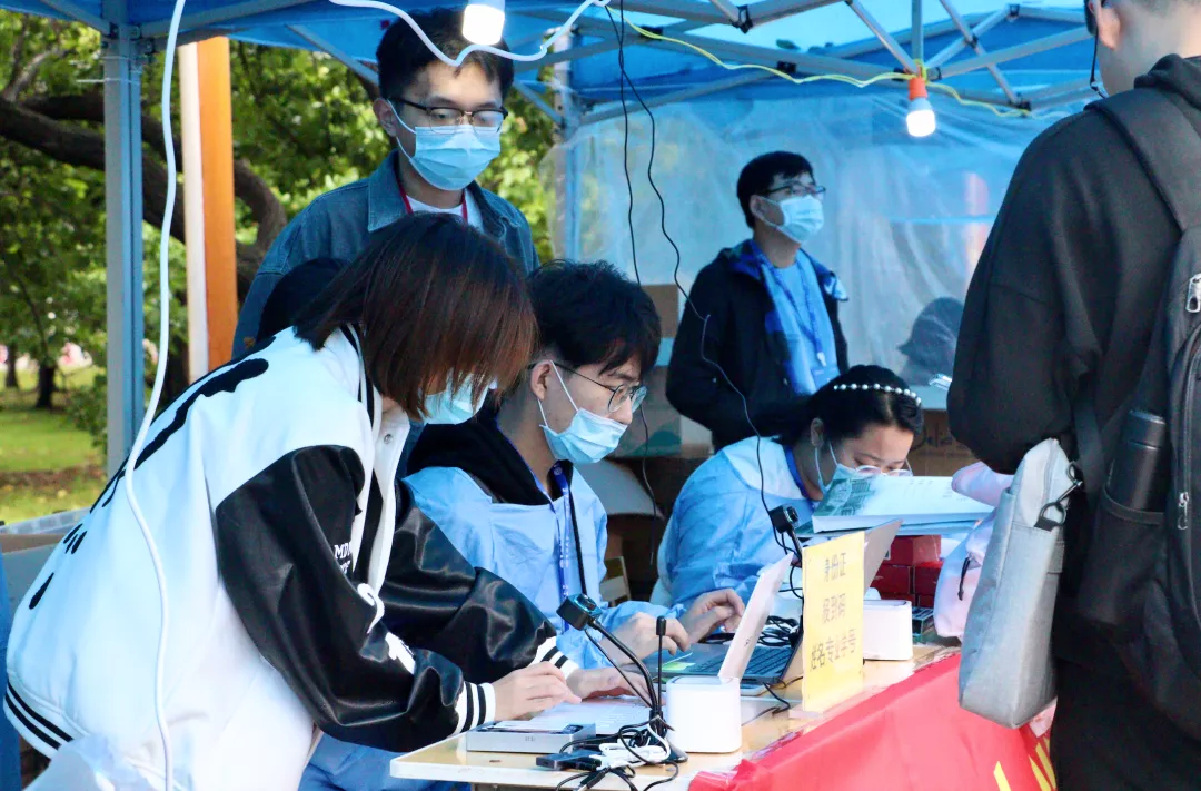 尽管阴雨连绵,天气寒冷,但学院的志愿者们仍耐心地在雨中等候。迎接处的志愿者们看到学弟学妹到来时,热情地上前迎接,帮助学弟学妹从西门引导至学院报到处;报到处的志愿者们负责检查新生上交的行程卡、吉祥码与核酸检测报告,帮助他们完成刷身份证和人脸识别;到达公寓服务站后,新生领取校园卡和寝室钥匙。从校门口到报到处再到公寓楼前,到处都是志愿者们的身影,他们忙碌的身影是雨天最美的风景线。