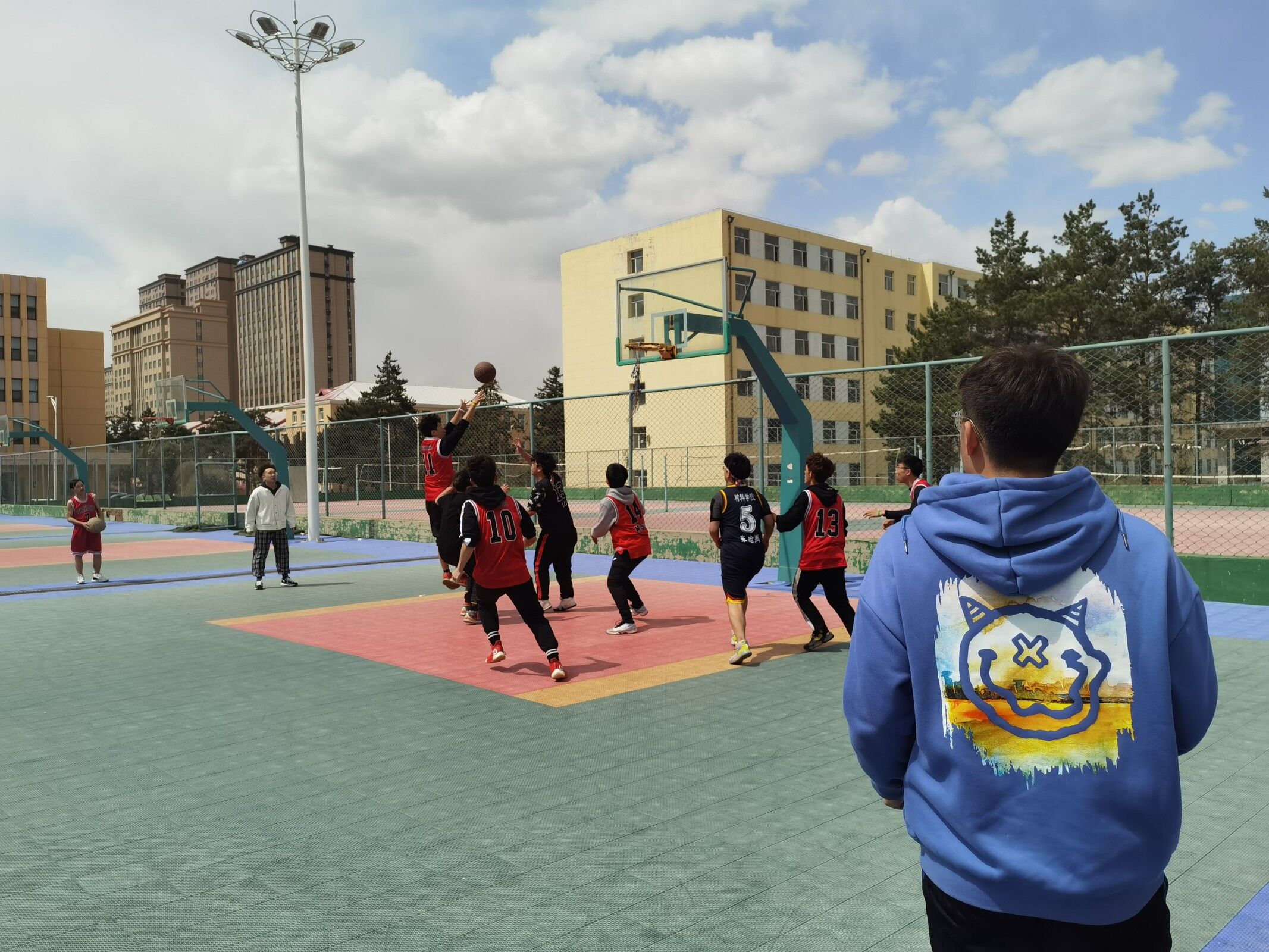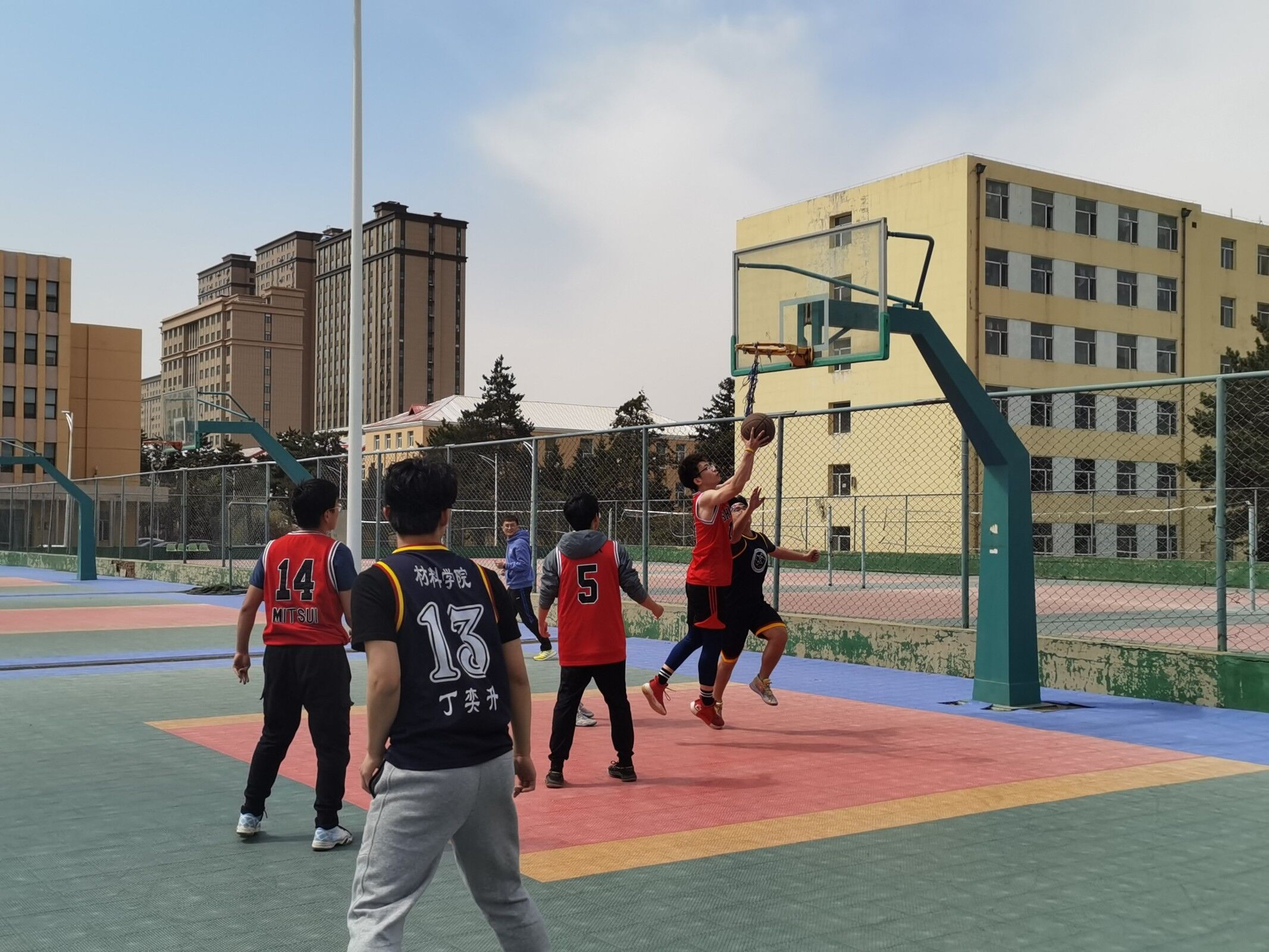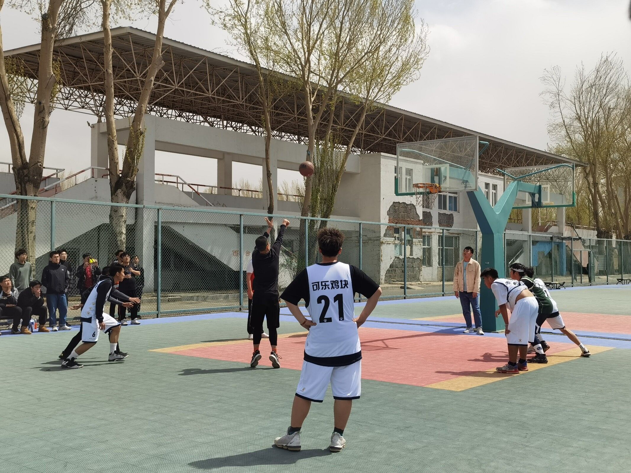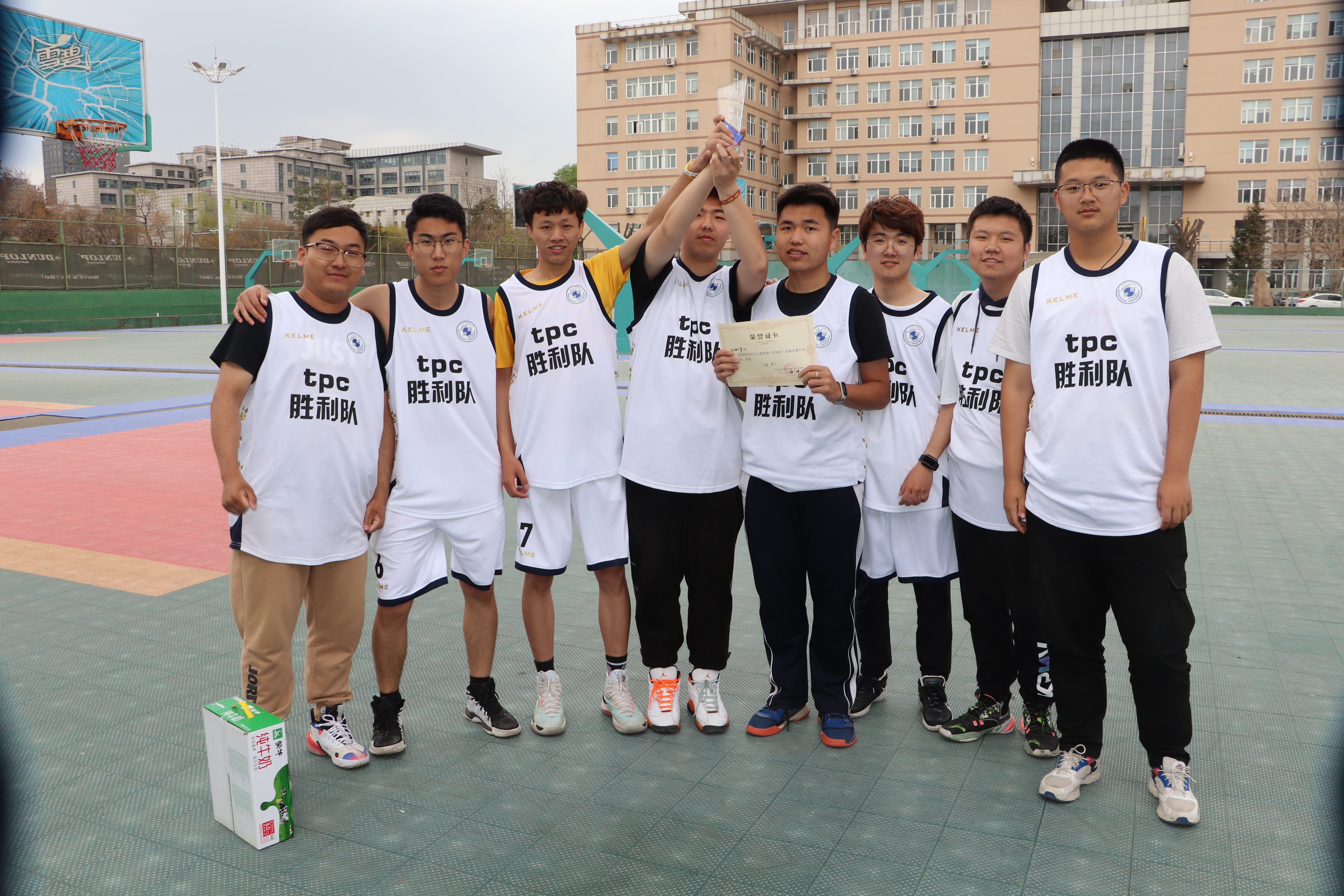 本次比赛是以同年级的班级为单位组队,4月25日—4月28日进行小组赛,4月29日—4月30日进行淘汰赛与总决赛。比赛还未开始,球员们早已抵达赛场,做着紧张有序的准备活动,未参赛的同学也找到班级所在位置,准备为班级篮球运动员加油助威。赛场上,队员们全力以赴,精妙配合,愈战愈勇,抢板、上篮、三分,一次次征服篮筐;赛场下,观众摇旗呐喊,不断为队员打气、喝彩。在半决赛中,20级13班“tpc胜利队”全力投入比赛,经过激烈的对抗,18级“材料飞豹队”以微弱的优势取得胜利。本着公平原则,20级13班“tpc胜利队”获得冠军,18级7、10、12班“打完去金池”联队获得亚军,18级“材料飞豹”联队获得季军。“杏花杯”篮球赛完美谢幕。