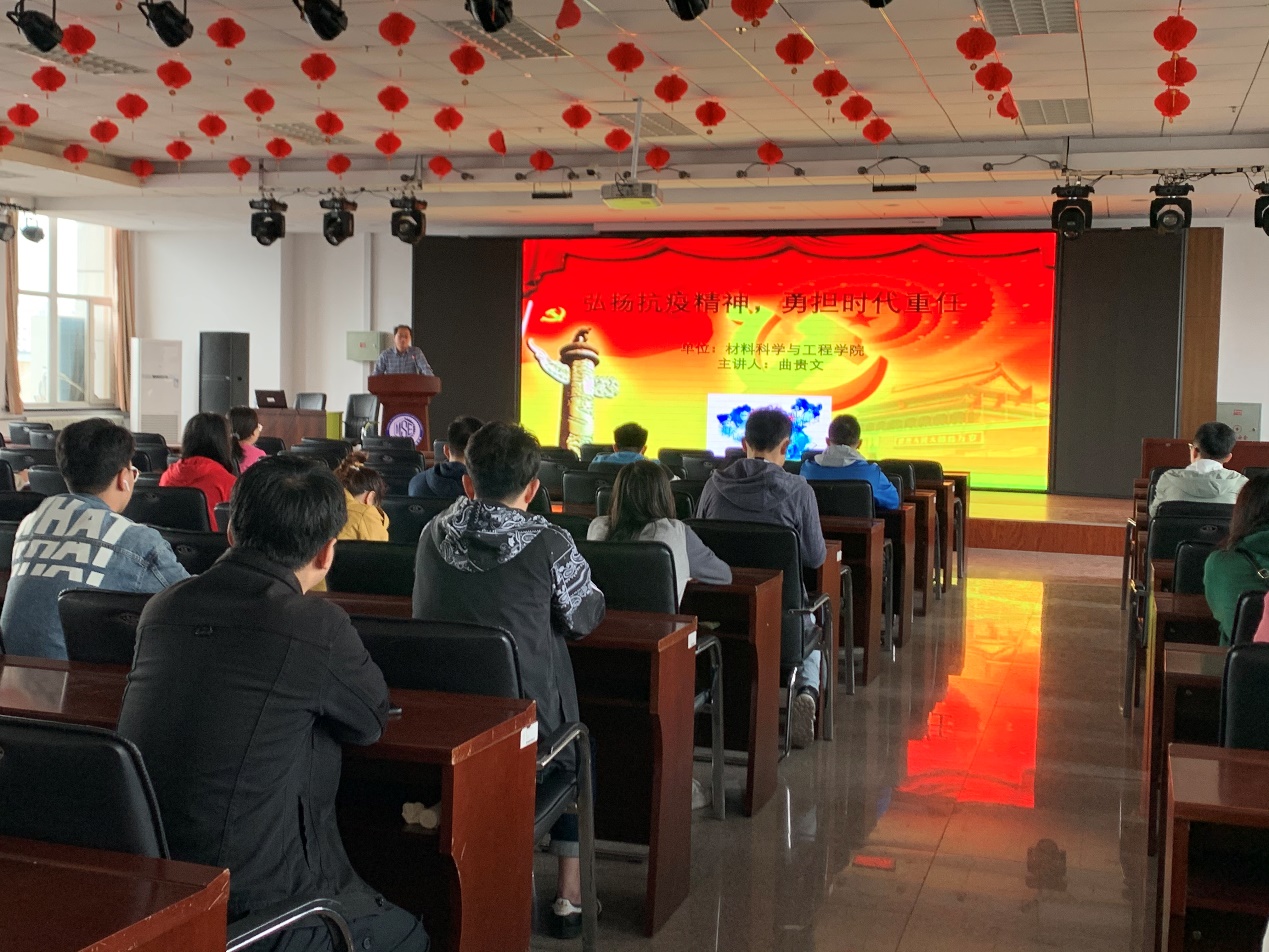 2020922900时,在材料管八楼会议室,学院党委副书记曲贵文以“弘扬抗疫精神,勇担时代重任”为题,为2019级硕士研究生党支部及2019级博士研究生党支部开展了一次党课活动。