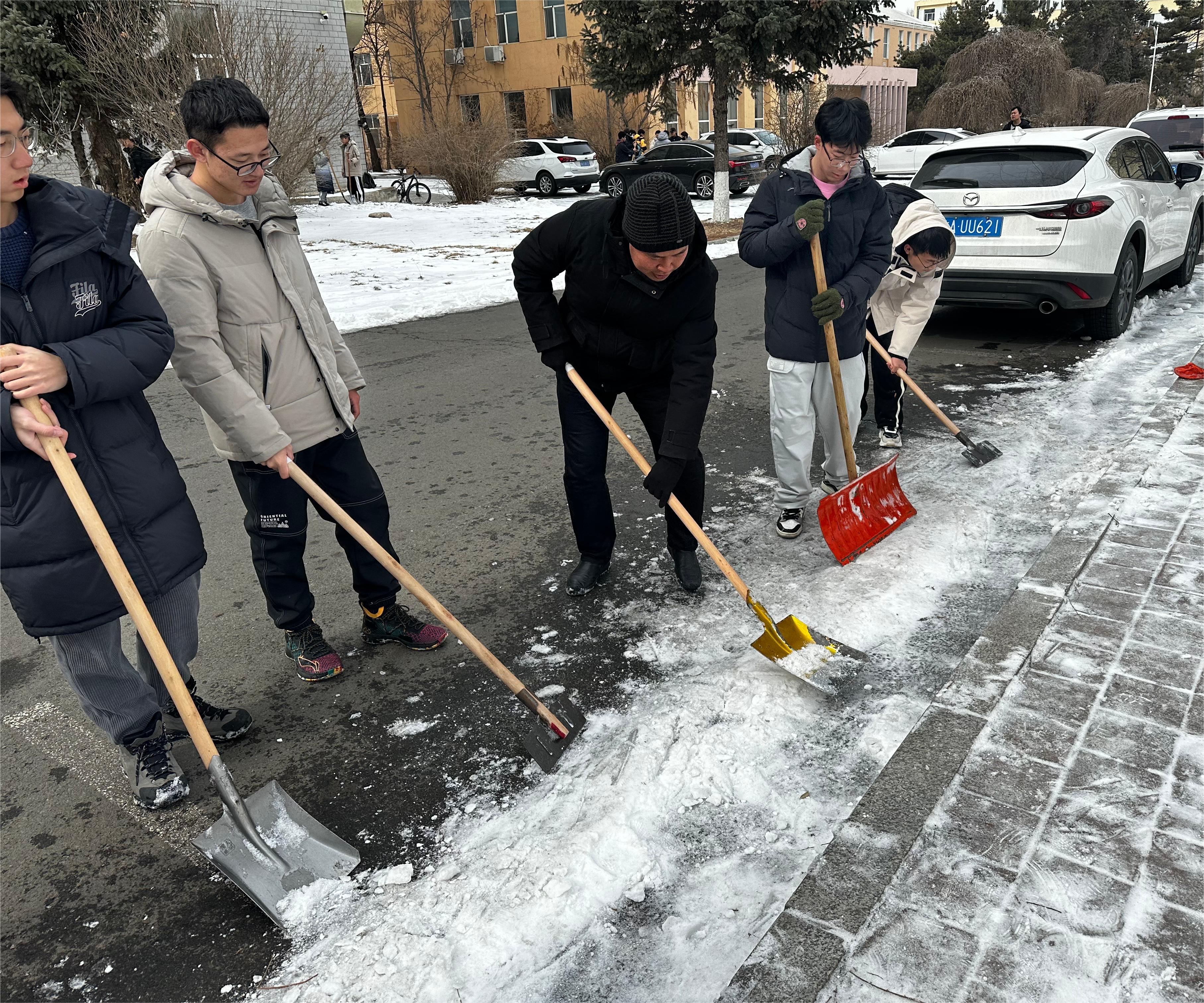 午后,2023级本科生辅导员严冬老师和同学们来到材料馆门口,拿着铁铲、铁锹等清扫工具,开始了紧张而有序的扫雪工作。同学们以班级为单位分成小组,分工合作。虽然天气依然寒冷,但同学们工作认真而高效。他们用自己的行动,展现了大学生的责任和担当,为校园新学期的秩序和安全贡献了自己的一份力量。