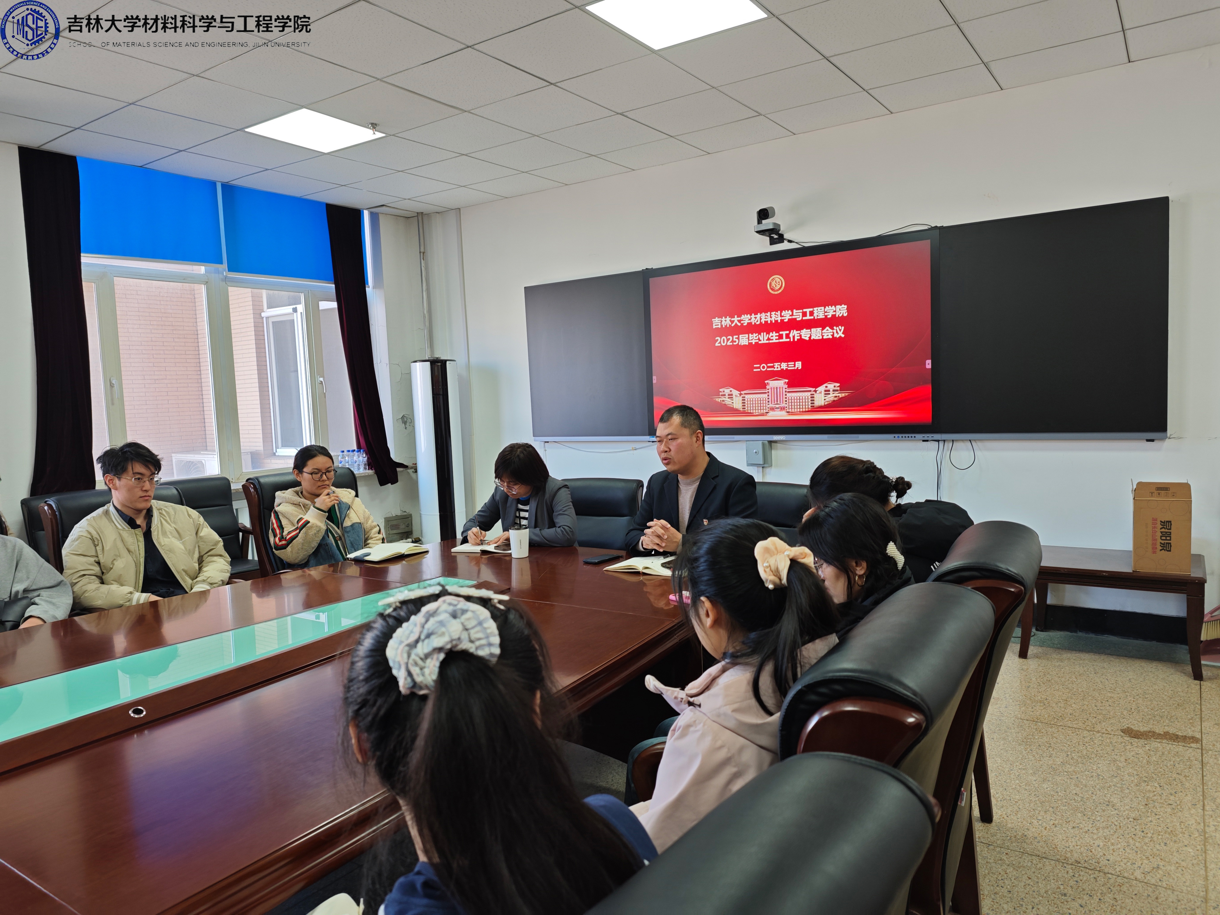于2025年3月13日中午在南岭校区逸夫机械材料馆410会议室召开毕业生工作专题会议,学院党委副书记兼副院长华蕊老师、学院本科毕业班辅导员严冬老师,南岭校区2021级各行政班班长、团支书,以及2021级各教学班负责人参加了本次会议。