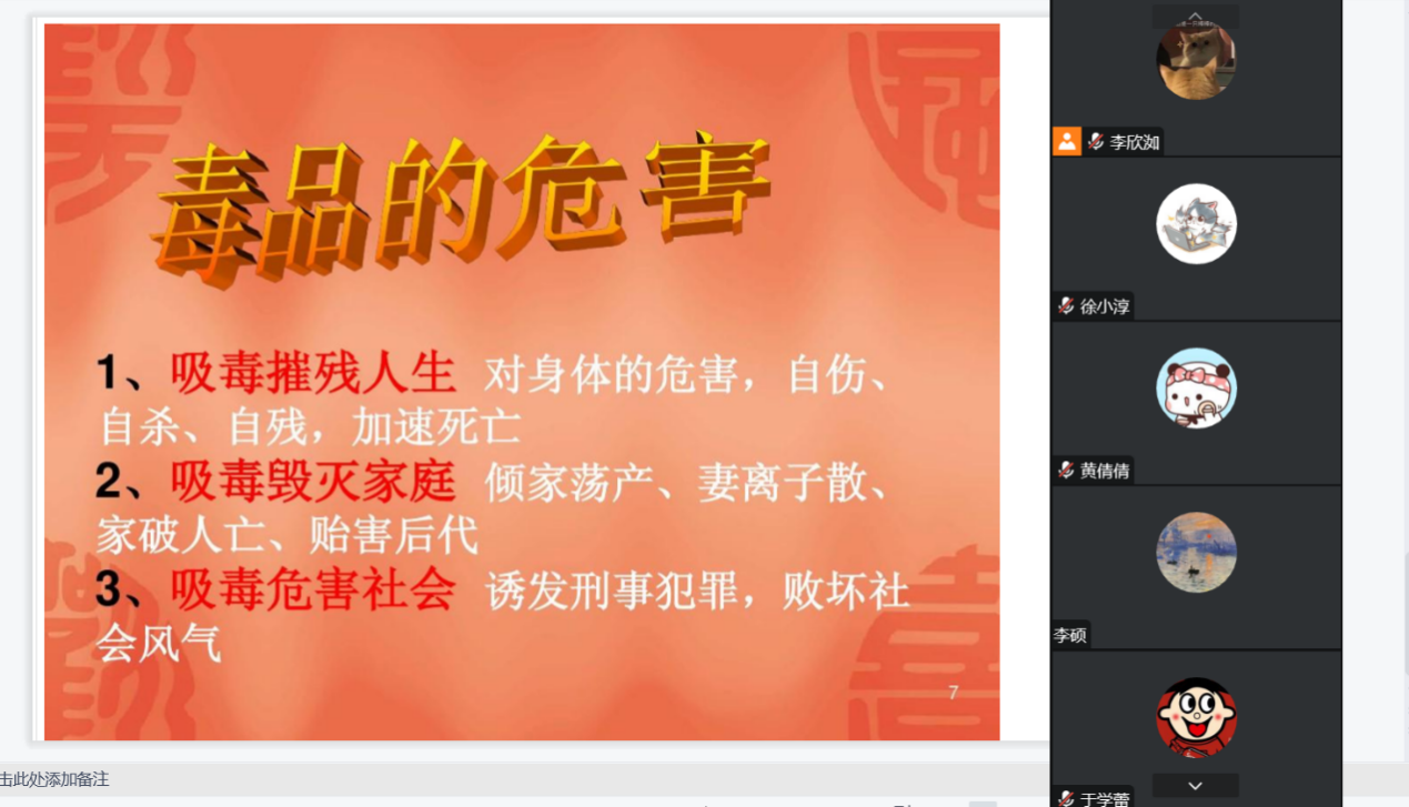活动中,禁毒志愿者利用图片呈现、观看视频、真实案例剖析等多种形式,详细介绍常见的毒品种类、吸食毒品的诱因及其对人体和家庭的危害及对社会的影响。使同学们树立正确的人生观,不盲目追求享受、寻求刺激、赶时髦去接触毒品;不听信毒品能治病,毒品能解脱烦恼和痛苦,毒品能给人带来快乐等各种花言巧语;不结交有吸毒、贩毒行为的人。